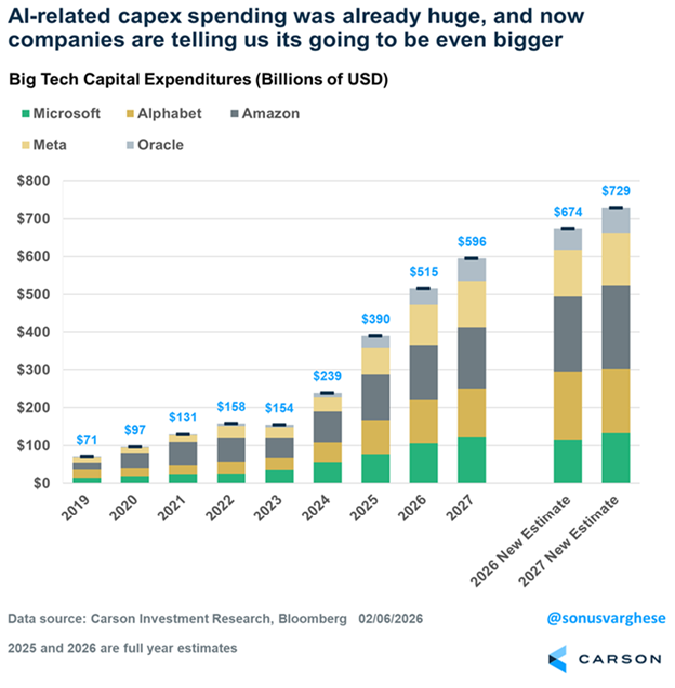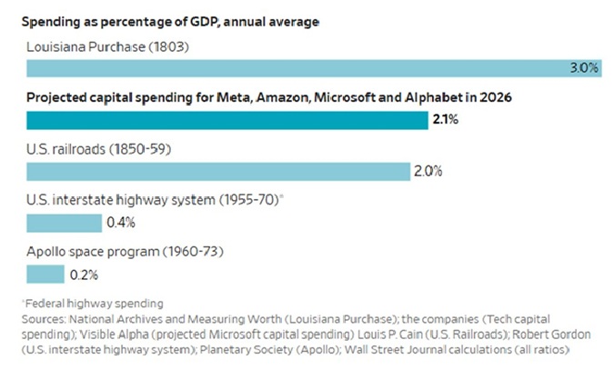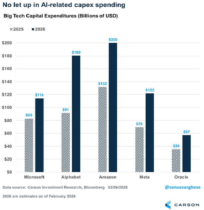 The aggressiveness of 2026 spending implies a significant front-loading of cash flows into infrastructure, which will structurally compress free cash flow and margins in the near term, despite strong revenue growth narratives. This creates a macro setup where tech valuations remain highly sensitive to interest rates and growth expectations, as elevated Capex reduces shareholder returns and increases execution risk. In equity markets already heavily concentrated in a few tech giants, this investment surge increases downside asymmetry: if AI monetization lags expectations, the profit cycle could underperform the capital cycle, leading to valuation de-rating and broader index pressure.