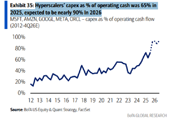 This chart shows that hyperscale’s’ capital expenditure as a share of operating cash flow is rising sharply, moving from around 65% in 2025 to nearly 90% projected in 2026. This means tech giants are expected to reinvest almost all their internally generated cash back into infrastructure, leaving very little buffer for dividends, buybacks, or balance sheet flexibility. The steep jump from 2025 to 2026 indicates an acceleration in spending intensity rather than a gradual investment cycle, signaling that companies are pushing capital deployment to historically extreme levels. Such high reinvestment ratios typically mark late-cycle phases of capital booms, where incremental returns on capital become uncertain and execution risks increase significantly.
