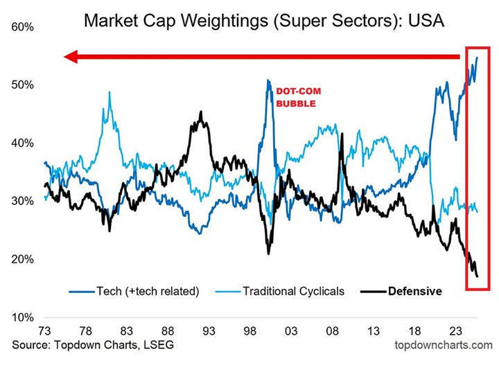 This first chart shows that US technology and tech-related stocks now make up 55% of total market capthe highest share in history, even above the Dot-Com Bubble peak. Defensive sectors, by contrast, have been pushed to just 18%. This means the entire market has become a one-sector bet: if mega-cap tech stumbles, the index stumbles with it.