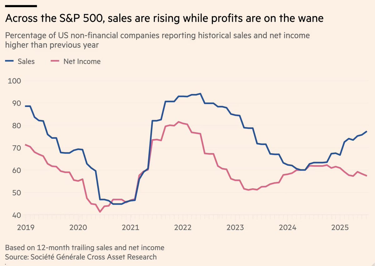 This second chart adds another layer of concern. While sales across S&P 500 companies are rising, the share of firms reporting higher net income has been trending steadily lower since 2022. This reveals that revenue growth is not translating into profitability, margins are under pressure from rising costs and heavy AI-related capex. In effect, investors are rewarding top-line growth at the very moment bottom-line strength is fading.