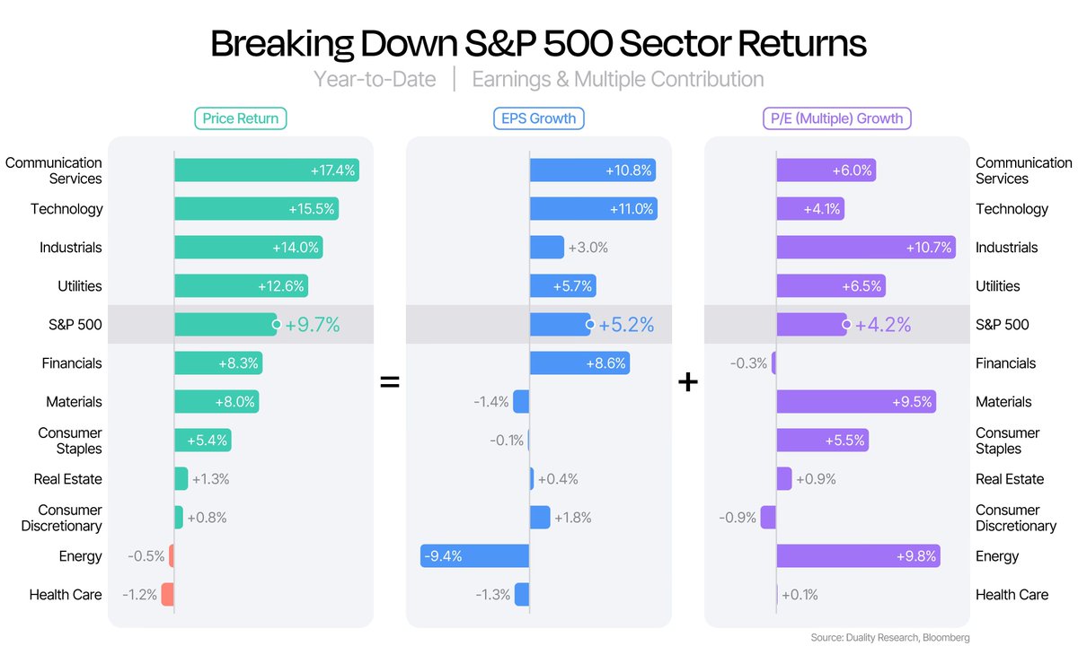 Now this third chart makes it clear: if we break down S&P 500 sector returns, the fragility stands out. Nearly 45% of the Year-to-date gains have come from P/E multiple expansion. Technology, industrials, and even materials show that most of the rise in prices has been driven by higher valuations rather than higher profits. Much of the much talked about EPS growth has been fueled by the AI frenzy and outsized bets on data centers and cloud, but that is clearly unsustainable over the long term.