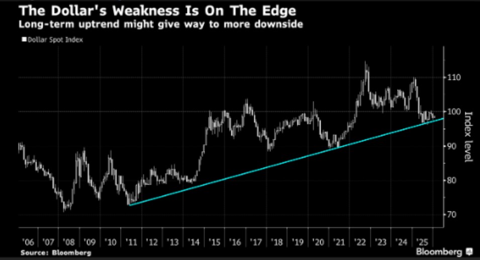 This second chart shows the dollar still sitting near a two-decade rising trendline, built from post-2008 crisis lows. The recent weakness has pushed the index toward this long-term support, not decisively through it. Historically, when the dollar tests such multi-year trendlines after sharp annual declines, it tends to rebound first, driven by technical mean reversion, defensive flows, and repositioning by long-term investors.